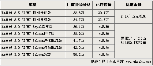 筆者從一汽豐田經銷商處了解到,目前新皇冠的價格出現了較大的降幅,最高優惠達到2.1萬元,同時在7月31日之前購車的客戶贈送萬元的禮包,包括了三種不同的禮包。目前皇冠2.5L兩款車型有黑色、白色現車供應,而3.0排量基本沒有現車,據銷售人員介紹,目前主要以2.5L銷售為主。如果訂車的話,需訂金1萬元,8月底9月初能夠提到現車。