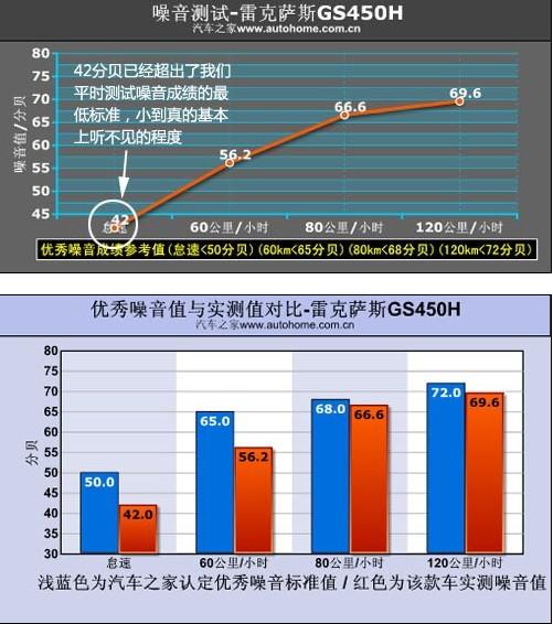 咱們再來說說GS450h的噪音環(huán)節(jié),怠速狀態(tài)下這款車的噪音值為42分貝,這個成績已經(jīng)比標(biāo)準(zhǔn)低了很多很多,實際坐在車內(nèi)基本上什么也聽不到,測試儀測出的這42分貝的聲音應(yīng)該是屬于人耳很難聽到的那種音頻。行駛中的噪音也非常理想,60km/h、80km/h、120km/h時速下的噪音成績分別為56.2分貝、66.6分貝、69.6分貝。混動車型最大的好處就在于它可以再任何適當(dāng)?shù)臅r候?qū)⑵桶l(fā)動機關(guān)閉,只靠電動機就可驅(qū)動車輪,所以在這種狀態(tài)下行駛時主要的噪音來源是風(fēng)噪和胎噪。總體來講,GS450h的噪音抑制水平是相當(dāng)高的,而且我們能看的隔音棉這類的隔音設(shè)備也非常規(guī)整且厚實,但通過技術(shù)層面的改進抑制噪音的做法我們必須表示肯定。