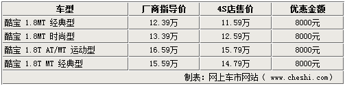酷寶系列車型,不僅外形時尚,動力也相當充沛,不僅可與進口跑車如蓮花競速相媲美,也帶動了自主跑車市場的競爭。近期網(wǎng)上車市網(wǎng)站了解到,隨著市場競爭的加劇,現(xiàn)在各家4S店均可給出全系8000元的現(xiàn)金優(yōu)惠,令此車型再次引起關(guān)注。具體詳情如下: