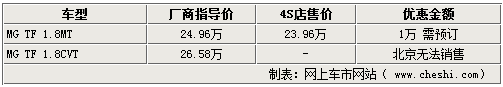 與比亞迪S8同為敞篷跑車設計的MG TF跑車在北京市場仍為訂單銷售狀態。網上車市網站由北京名爵經銷商處了解到,現在購買名爵MG TF跑車,雖然在價格上有萬元的優惠,但是各店均無現車,需要提前預訂,具體詳情如下: