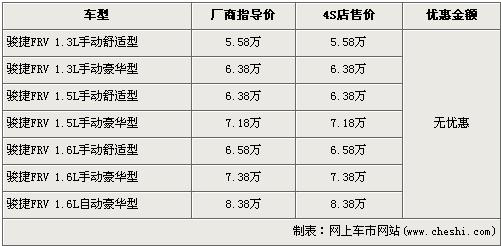 據經銷商處銷售人員介紹,駿捷FRV在售車型已經擴大到了7款,新增加了分為舒適版和豪華版的手動1.5L排量車型。目前購買駿捷FRV的消費者在現金方面沒有任何優惠,并且全系1.3L和1.6L車型均無現車,1.5L排量車型現車數量一般,如果錯過此批現車的消費者需交訂金2000元,最早半個月后提車。