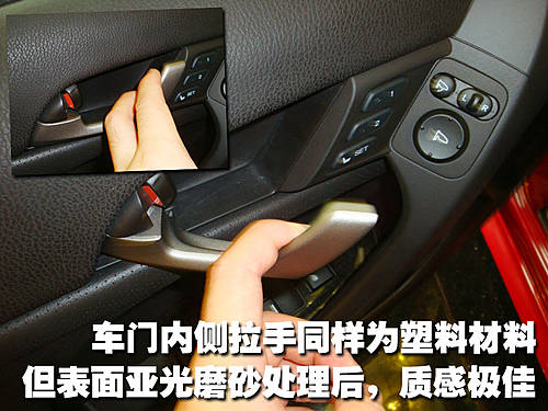 車門內側拉手采用磨砂設計,在提升整體檔次的同時手感也比較到位。此外,車門內拉手周邊配件的做工也很細致。