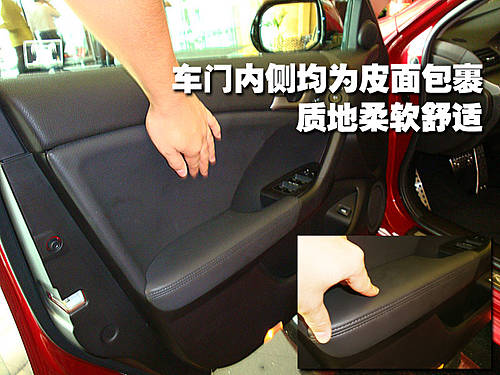 車門內板為高檔真皮包裹,而且軟硬適中,手臂長時間擱置不會感到不適。