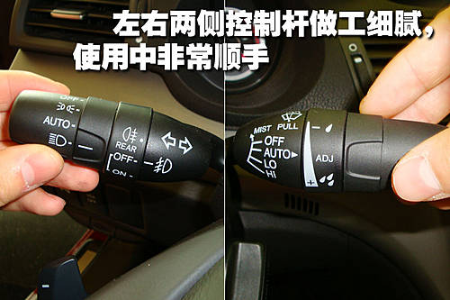 方向盤左右兩側控制桿為軟橡膠包裹手感細膩,無論是看、觸都能感覺到這部分材料的工藝質量很好。并且旋鈕設計能夠滿足手指粗大駕駛者的使用及調節。