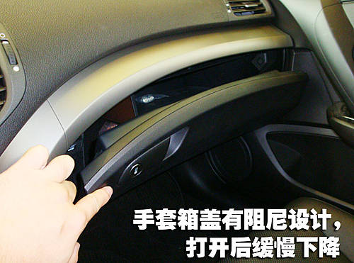 思鉑睿的手套箱為有阻尼設計,在打開手套箱后不會因重力而自由下落,手套箱內部空間較大,分層設計可以方便乘客查找物品。
