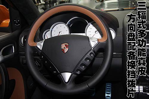 保時(shí)捷卡宴Turbo S三輻式多功能方向盤(pán)采用真皮材質(zhì),手感舒適且做工考究。通過(guò)方向盤(pán)上的換擋撥片可實(shí)現(xiàn)類(lèi)似跑車(chē)的手動(dòng)換擋,突顯駕駛樂(lè)趣。而集中在方向盤(pán)左右的快捷按鈕觸手可及,方便日常使用。