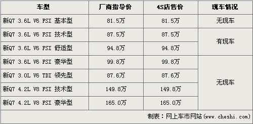 據北京奧迪4S店銷售人員介紹,新款的奧迪Q7有三個排量共7款車型,售價區間為81.5萬元-165萬元。目前店內已經到第一批先期預訂的奧迪新Q7現車,車型為3.6L技術型和3.6L舒適型。現在欲購買新Q7的消費者需交1萬元訂金,下個月中旬方可提車。