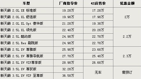 據東風日產經銷店銷售人員介紹,目前新天籟(報價 參數 圖片 論壇)2.0舒適版和2.5領先版等比較受歡迎的車型有現車供應,主要為銀色/灰色等外觀。其他尊雅版車型需要預訂。目前的優惠幅度為2萬元-2.3萬元不等,入門車型優惠后僅售17.28萬元,對消費者而言性價比比較強。