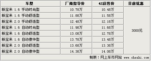 據4S店銷售人員介紹:目前大眾新寶來全系可優惠3000元。目前新寶來全系現車較充足,顏色也比較齊全。如需預定車輛需等待2周至一個月時間,訂車周期較短,如著急用車的朋友請安排好用車時間。車價方面,新寶來在優惠3000外,個別經銷商還可送一些簡單裝飾,主要是腳墊等。
