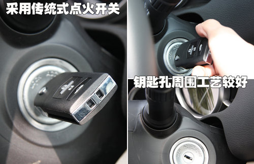 這款2.0L車型采用了傳統式點火開關,實際使用中點火也很快速,抖動不明顯。睿翼頂配車型則配有一鍵式啟動按鈕。轉向柱周圍的做工較好,塑件縫隙均勻、細小。