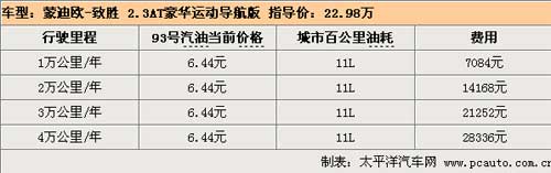 致勝的2.3L發動機的最大功率為118Kw/6500轉,最大扭矩為205Nm/4000轉。這與馬自達6 2.3L的數據相差并不是太多,估計新蒙迪歐致勝的動力系統還是來自于馬自達6。 蒙迪歐致勝2.3自動版的百公里油耗成績為11L,每行駛1萬公里需要費用為7084元。