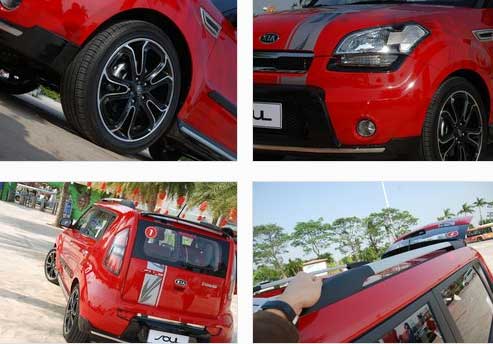 東風悅達起亞SOUL由官方提供了一套改裝配件,正如您在上面照片中所看到的,包括前后保險杠、大燈下方的燈眉、18寸黑色花型輪轂、車身側面裙邊包圍、后尾翼以及車身拉花,一臺普通的SOUL就這樣變身為了一臺與眾不同的SOUL,多了幾分動感也多了幾分張揚。