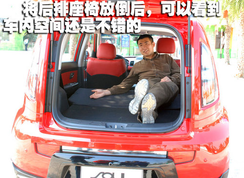 后排座椅可以全部放倒或是4/6比例分割放倒,這里面的空間足夠容納兩個人或是一臺大洗衣機或是電視了,買來SOUL用來搬家也許不是最好的主意,不過一旦有需求SOUL真的可以滿足儲物的需要了。后排座椅在乘坐三名乘員的時候顯得比較緊湊,畢竟這還只是一臺A0級的小車而已,所以對于空間我們也不應有太多的奢求。