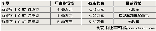 長安鈴木新奧拓上市時間比較短,市場上現車比較緊缺。據了解,新奧拓銷售火爆,只有手動豪華版有現車,以藍色、白色、金色為主,提車需要在4S店加2000元。如果不加價提車,消費者需要交付2000元訂金,其中手動擋車型需要等1.5個月左右,而自動擋車型需要等2個月左右。
