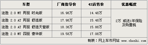 據北京現代北京地區4S店銷售人員介紹,途勝車型優惠現金2萬元或贈送購置稅及全年保險,兩項優惠只能選擇其一。目前店內現車供應主要為銀色、黑色為主,四驅部分車型需要預訂,訂金5千元,一周左右時間可以提車。如消費者有意購買,到店詳談會有更優惠的價格。北京地區各4S店由于訂單不同,各店銷售的現車顏色有所不同。