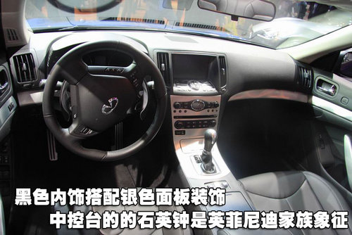 內飾的風格依然保持了英菲尼度家族式的風格,中控臺中央的石英鐘無疑就是它典型的的家族特征。黑色內飾搭配銀色面板裝飾,沉穩中不失活力。