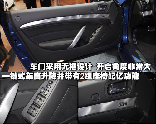 G37敞篷版采用了跑車流行的無框式設計,車門的開啟角度非常大,極大方便了上下車。同時駕駛門集合了一鍵式車窗升降以及電動后視鏡調節。并帶有兩組座椅記憶功能。