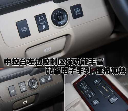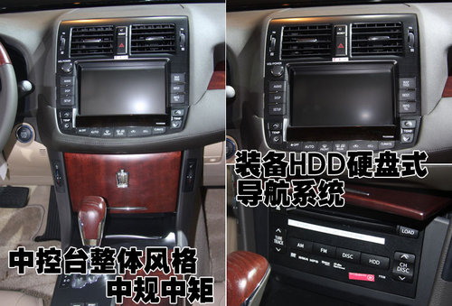 新皇冠的中控臺按鈕的設計均勻的布局在顯示屏四周,下方為隱藏式CD設計。整體的風格上顯得過于沉穩而顯得活力不足。同時裝配的HDD硬盤式導航系統等多項高端配置為消費者提供了更多的尊貴享受。
