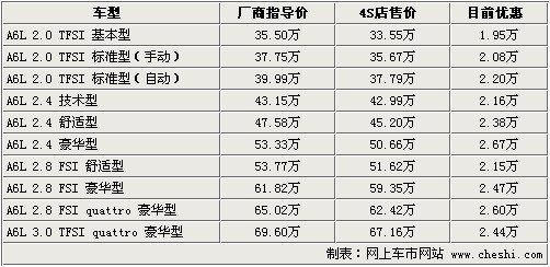 據奧迪4S店銷售人員介紹:目前2010款奧迪A6L車系部分車型有現車,2.0T與2.4升車型有部分黑色現車,顏色不是特別齊全,預訂需等10天左右,每款車型具體情況有所不同。2.8升排量車型目前現車較少,只有個別款有現車,顏色為黑色,如需預定需等1個月以上。優惠方面,奧迪A6L全系最高優惠2.67萬元,相比之前有所提高。