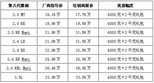 新雅閣,自誕生之日起就打著“史上最強雅閣”的旗號,10月更是一舉奪得昆明中級車上牌量亞軍,其實力不容小覷。近日,車天下編輯從廣本梁源店獲悉,自2009年12月14日至12月31日購置雅閣車型即可享受4000元歲末現金優惠以及2000元店慶購車禮包。具體車型及詳細優惠政策,如下表: