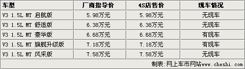 據(jù)東南汽車4S店銷售人員介紹,目前V3菱悅現(xiàn)車比較少,只有豪華版和旗艦升級(jí)版有現(xiàn)車銷售,風(fēng)采版少量現(xiàn)車會(huì)在近期到店。而其他車型目前只能接受預(yù)訂,預(yù)計(jì)半個(gè)月左右能夠提到現(xiàn)車。目前購(gòu)買V3菱悅沒有任何優(yōu)惠政策,而且并不贈(zèng)送裝飾。