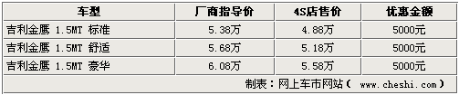 據(jù)北京地區(qū)吉利4S店銷售人員表示,吉利金鷹目前只有1.5L手動(dòng)車型有現(xiàn)車銷售,自動(dòng)版車型則沒有現(xiàn)車,并且不接受預(yù)訂,具體到店時(shí)間目前還不得而知。不過,現(xiàn)在購(gòu)買吉利金鷹手動(dòng)版車型,全系都可以優(yōu)惠5000元。