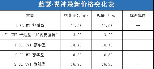 近日,編輯從北京地區(qū)東南三菱4S經(jīng)銷商處了解到,藍瑟·翼神在店內(nèi)有少量現(xiàn)車(紅色、黑色),其中1.8L CVT舒適型在店中加裝了真皮座椅,價格是原指導(dǎo)價增加3000元。相比之下,編輯了解到藍瑟·翼神在綜合經(jīng)銷商處雖然沒有現(xiàn)車,但是現(xiàn)在訂車可以優(yōu)惠2000元現(xiàn)金,要等到春節(jié)之后才能夠提車。以下是藍瑟·翼神最新價格變化表: