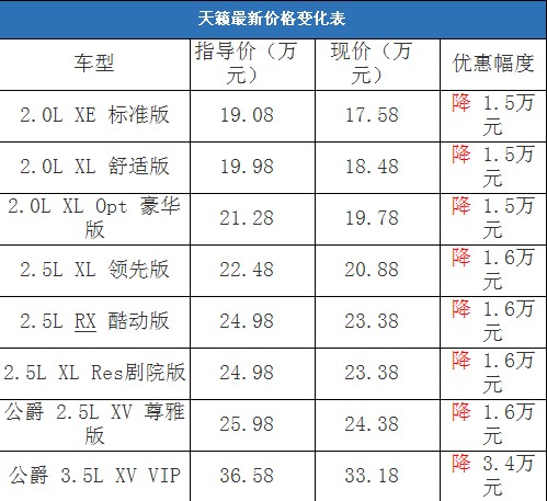 近日編輯從北京地區東風日產4S經銷商處了解到,天籟有少量黑色現車,部分車型預定需要等待20天到一個月左右就可以提車。據經銷商透露,目前2.0L排量車型可以優惠1.5萬元,2.5L排量車型可以優惠1.6萬元,而最高配天籟可以優惠3.4萬元,可見天籟2.5L排量車型的優惠幅度與1月份相比有了4000元左右的縮減。以下是新天籟最新價格變化表:
