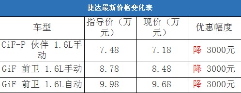 近日,編輯從北京地區一汽-大眾4S經銷商處了解到,捷達全系有少量現車在售,目前店內購車可以優惠3000元,并且贈送價值1400元的裝潢禮包(地膠、腳墊和車撣等)。以下是捷達最新價格變化表: