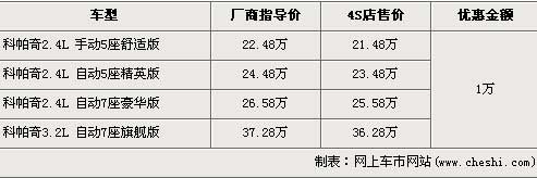 科帕奇車型分為2.4L與3.2L兩種排量,2.4L手動五座舒適版和2.4L七座手自一體豪華版兩款車型先期上市,2.4L 5座精英版和3.2L排量的車型隨后也上市銷售,全車系售價區間為22.48萬元-37.28萬元。近期根據網上車市價格監測顯示,科帕奇2.4L車型全系優惠1萬元,具體詳情請看下表: