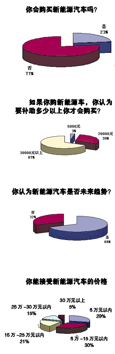就新能源汽車目前的現狀,記者向近100位讀者做了調查,很多消費者在接受調查時表示,新能源車的技術還不成熟,但是目前的新能源車價格卻很高,對于普通的消費者來說,還不如買一部普通的用油小車。