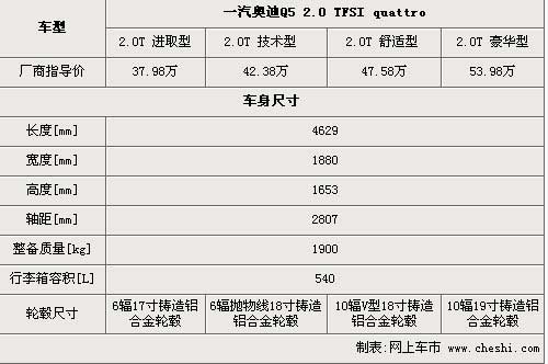 奧迪Q5 4款車型的長寬高均為4629mm*1880mm*1653mm,雖然從外形上看,奧迪Q5與奔馳GLK、沃爾沃XC60等競爭對手相比,體型略顯中等,但是2807mm的軸距在這幾款SUV車型中可以算得上是數一數二的了,這也就意味著奧迪Q5的內部空間將更加充裕。