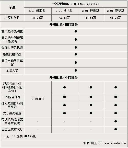 國產(chǎn)奧迪Q5全系均安裝了全景天窗,在車型均安裝了鋁飾行李架軌道,并且前風擋以及側(cè)窗都安裝了帶有隔熱功能的吸能玻璃,愛美的女車主可以不必在為了怕曬黑自己,而涂上厚厚一層的防曬霜了。除了入門級的進取型之外,其他三款車型均安裝了帶有LED日間行車燈的雙氙氣前大燈,并且?guī)в星按鬅羟逑垂δ埽琇ED尾燈也安裝上身。雖然進取型沒有標配這些配置,不過只要您愿意,花費9000元這些配置同樣可以選裝上身。頂配的豪華版車型上,自適應式前大燈可以比其他三款車型給駕駛員提供更人性化更廣闊的視野范圍。