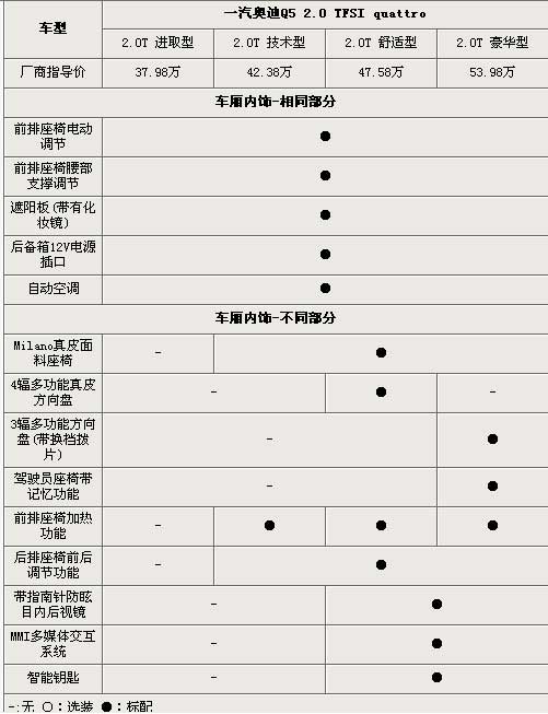 在內部配置上,奧迪Q5前排的駕駛員以及副駕駛提供了帶有腰部支撐功能的電動可調節座椅,除了進取型外,其他3款前排座椅均帶有加熱功能,且豪華版車型的前排座椅還配有電動記憶功能。入門級的進取型采用的是Havanna織物面料座椅,而其他3款車型均采用了Milano真皮包裹的座椅。進取型以及技術型采用了4輻真皮方向盤,舒適型的4輻方向盤帶有多功能鍵,為了增添駕駛樂趣,豪華版車型在3輻多功能真皮方向盤的后方配有換擋撥片。值得一提的是,技術型、舒適型以及豪華型的后排座椅可以前后調節100mm,為體型稍胖的乘客提供了更大的腿部空間。