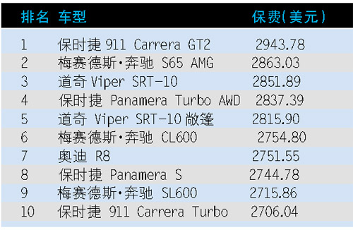 第一名跟第十名的保費(fèi)差距大約也才只有240美金,而在前十名之后的11~20名中,基本上都是梅賽德斯·奔馳的天下,包括CL65 AMG、S600、SL65 AMG以及CL63 AMG都入選在內(nèi),除此之外,還有寶馬M6(硬頂及敞篷版)和760i以及兩款捷豹XKR機(jī)械增壓版本。不過,文章并沒有講明保險(xiǎn)金額的實(shí)際保障內(nèi)容是什么,所以跟國內(nèi)的保費(fèi)也不太好比較。可是,可以看出,榜單中的這些車輛售價(jià)也并不便宜,這點(diǎn)兒保費(fèi)還真不算什么。(記者陳鑫欣)