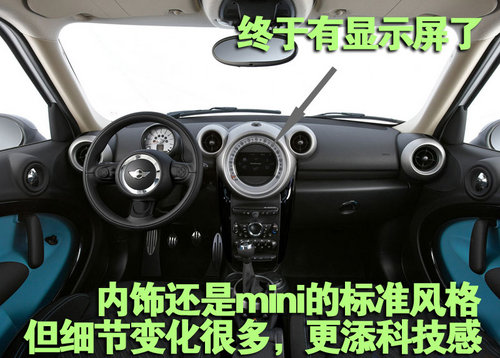 也許有些朋友會抱怨:mini的內飾的確個性,但是除了一副自動空調之外居然沒有時下最為流行的車載顯示屏。而我們通過這款最新的Countryman就看到了一些希望,在整體上依然是我們所熟悉的mini內飾之外,中控臺中央最明顯的變化就是那塊彩色顯示屏。