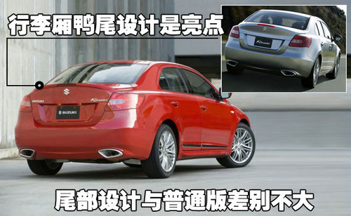 性感的線條運用來到車尾,顯眼的行李廂鴨尾設計,成為Kizashi車尾的焦點所在。而線條豐富的保險杠造型,以及整合左右雙出尾管的獨特設計,亦將Kizashi的動感精神表露無遺。