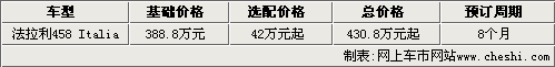 據法拉利北京展廳銷售人員介紹,目前法拉利458 Italia已經有展車抵達展廳,消費者可隨時到店看車。而且法拉利458 Italia已經開始接受預訂,起價為388.8萬元,消費者如果預定這款新車,至少要選裝42萬元的配置,總價格為430.8萬元起。另外,消費者如果現在下訂單的話,需要在明年1月份才能提到現車。