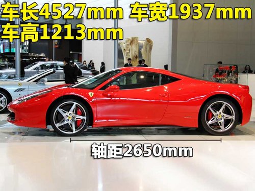 法拉利458 Italia是一款車長 4,527mm、車寬1,937mm、車高1,213mm、軸距2,650mm與空重1,380kg的雙座跑車,整體車身尺碼雖是略微較F430放大,車高卻降低1mm。而在中后置V8引擎的影響下,車身前后配重比是42:58。