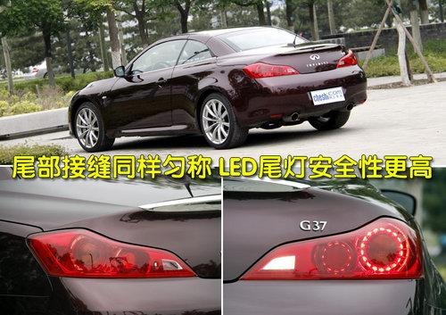 英菲尼迪G37敞篷版較四門版車型更為動感時尚,整體設計偏向年輕化群體,外觀整體線條流暢,圓潤的設計絲毫不顯突兀。外觀做工沿襲了英菲尼迪造車一貫的細膩風格,模具制造與噴漆工藝均屬上乘,前大燈與引擎蓋接縫十分勻稱,保險杠、發動機蓋及水箱框架等周圍的接縫同樣非常勻稱。