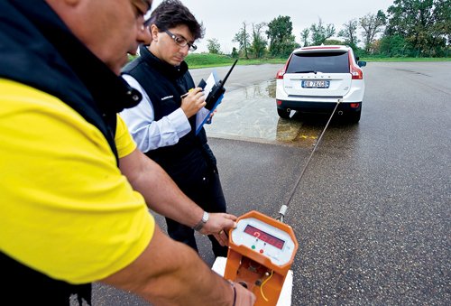 這一測試的目的在于測量車輛的牽引力,我們要使用一個十分精確的測量范圍達數(shù)千千克的測力計。正如在照片中看到的,車輛的四個輪子都在濕滑的大理石上,我們在上面說過,其附著力與在冰面上差不多。測力計的一邊通過一條鋼索與車體相連,另一邊固定在一個位置上。測試員啟動汽車把鋼索拉直,然后繼續(xù)加油直到車輪開始打滑,這時很多因素都要考慮,包括發(fā)動機功率、車的重量、輪胎的合成材料等,這些都是重要的參考數(shù)據(jù)。四驅(qū)車比兩驅(qū)車明顯占據(jù)上風(fēng),特別是XC60,其四驅(qū)版的牽引力比兩驅(qū)版高出了74%。Kuga兩個版本的差距為41%,略微小些。需要說明的是,正像前面說過的,沃爾沃兩款車的功率相差30馬力,其他方面沒有大的差別。在主要測試結(jié)束后,我們換了個地點重復(fù)剛才的測試,不是四個輪子都在大理石上,而是兩個在大理石上,兩個在瀝青上,仍然為濕滑路面。這也是為了測試防滑系統(tǒng)的功效,這時需要差速器的機械鎖止裝置發(fā)揮作用,Kuga和XC60上都沒有這一裝置。兩個輪子在瀝青上增加了附著力,可以看到測力計上顯示的數(shù)字與上次相比四輛車都增大了。福特兩驅(qū)車牽引力為602千克,四驅(qū)為820千克;沃爾沃兩款車的差距還是那么大,兩驅(qū)為710千克,四驅(qū)為1050千克。