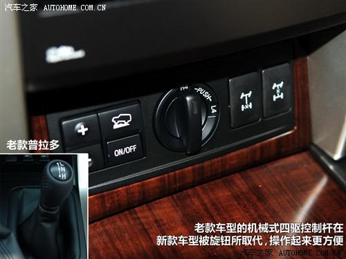 相比老款普拉多,新款取消了機械式的四驅控制桿,而改為一個切換高速四驅和低速四驅的旋鈕。同時車內的電子設備也增加了很多。其中最重要的就是MTS多地形可選駕駛輔助,這套系統類似路虎的全地形反饋系統,預設了幾種不同的駕駛模式,作于在于減少駕駛員的操作難度、提供更有效地模式。