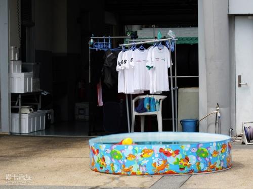 走進賽車場后,我們發現每個pit房后面都有一個兒童游泳池↑