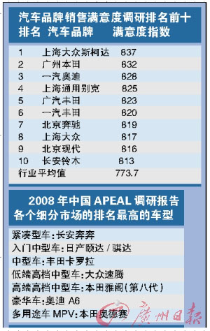 無獨有偶,由國務院國資委研究中心、中國汽車工業協會、中國質量協會、中國環保協會等權威機構創立的獨立第三方調研活動——“2008中國汽車品牌銷售滿意度調查”結果出爐,2008年汽車銷售行業滿意度指數平均分值773.7,較上年提升了5分。但與2007年相比,本土品牌的銷售滿意度大幅下降5.7%。