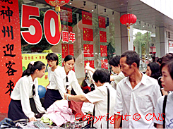 國慶節期間七天的假期對于中國內地的許多商家來說可謂商機多多,福州閩臺商行的售貨小姐將服裝擺到店門口以方便顧客挑選。