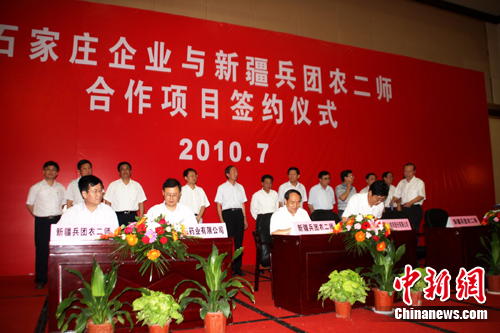 27日至30日,黃金忠一行揮師河北省會石家莊,在河北會堂舉辦首次大型推介會,并考察了石家莊市的神威藥業(yè)、常山紡織集團和偉天實業(yè)。盡管官方目前尚未公布簽約數(shù)據(jù),但已知農(nóng)二師和石家莊市三家企業(yè)“結(jié)緣”,順利簽訂了合作協(xié)議。根據(jù)協(xié)議,常山紡織集團將在農(nóng)二師開展棉花資源基地建設(shè)和29團棉紡企業(yè)的升級、擴建,神威藥業(yè)在該師建設(shè)中草藥基地并建立長期戰(zhàn)略合作關(guān)系,而河北偉天實業(yè)則與農(nóng)二師合作建設(shè)電廠。