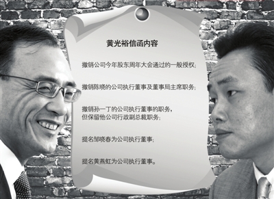 雖然黃光裕的經濟犯罪已經一審宣判,但黃光裕對上市公司的業績并不滿意,因此他要求舉行臨時董事會,并提出動議:包括撤銷公司今年股東周年大會通過的一般授權;撤銷陳曉公司執行董事及董事局主席職務;撤銷孫一丁公司執行董事的職務,但保留其為公司行政副總裁職務;提名鄒曉春、黃燕虹為公司執行董事。