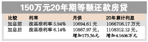 貸款利率上調,也令貸款企業和貸款買房買車的市民貸款成本上升。不過,由于銀行對首套房貸實行優惠利率,對于能獲取下浮利率的首套房貸客戶而言,此次加息帶來的實際影響將比加息幅度要小。以此前獲七折優惠利率的房貸客戶為例,打完折后,其承擔的實際利率,將由此前的4.158%上調為4.298%,實際上調幅度只有0.14個百分點。