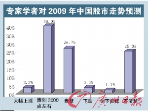 對于今年中國股市的走勢,40%的專家認為將恢復上漲到3000點左右,26.7%的受訪專家認為市場處于盤整期,認為“大幅上漲”和“下跌”的各占3.3%,另有25%的人表示“不清楚”。(詳見上圖) (文/記者黃蓉芳 通訊員徐剛、史玉梅)
