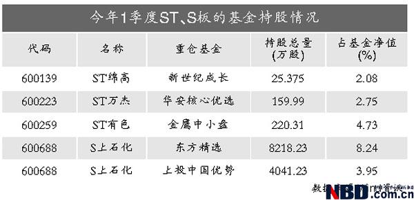 記者統(tǒng)計(jì)顯示,去年四季度,共有13只S股和ST股被基金持有;今年1季度末,有3只ST股和S上石化被基金重倉(cāng)持有,分別為ST有色、ST綿高和ST萬(wàn)杰。